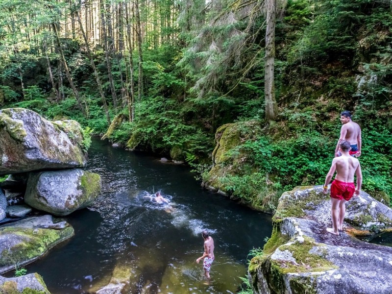 Weit ist es nicht, bis Du einen weiteren Höhepunkt Deiner heutigen Wanderetappe erreichst: Ein alter Schmugglerpfad führt Dich hinauf zum Bildsteinfelsen, wo sich Dir eine beeindruckende Weitsicht über das Albtal bietet. Großartig! Hast Du die Aussicht genossen, geht es wieder hinab ins Tal. Bald triffst Du auf den Albstausee, der ganz ruhig in der Landschaft liegt. Du kannst die Atmosphäre auf Dich wirken lassen, während Du ihn auf schmalen Pfaden fast komplett umrundest. Weiter führt der Albsteig vorbei an kleinen Bächen und Felsen zu Deinem heutigen Etappenziel in Häusern.